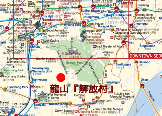 江北と江南をショートカットするルート上にあるため、ここを通過する市内バス(ブルーバス)が多く、バスの車窓から見る龍山の『解放村』の景観は、ソウルの一つの名物になっています。