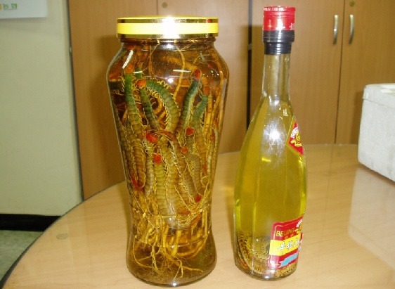 生きたムカデを傷つけないように、火バサミなどで瓶にいれ、そこに胡麻油を注いだ後、密封し、ムカデが溶けきるまで数年熟成させたものを、ムカデ油として使うのだそうです。